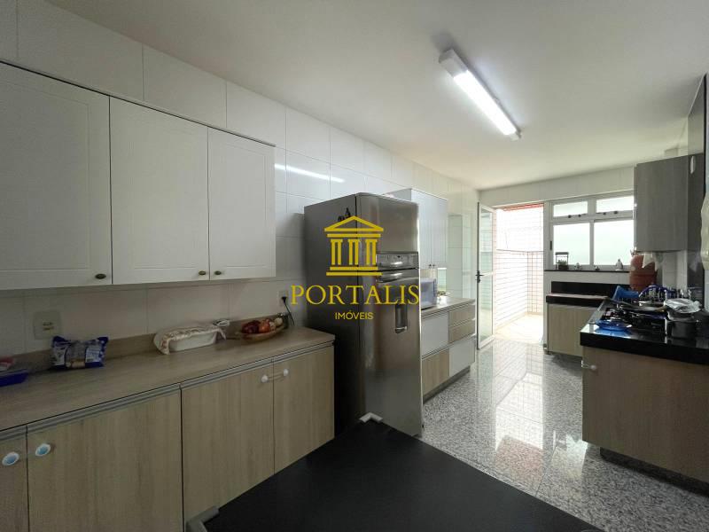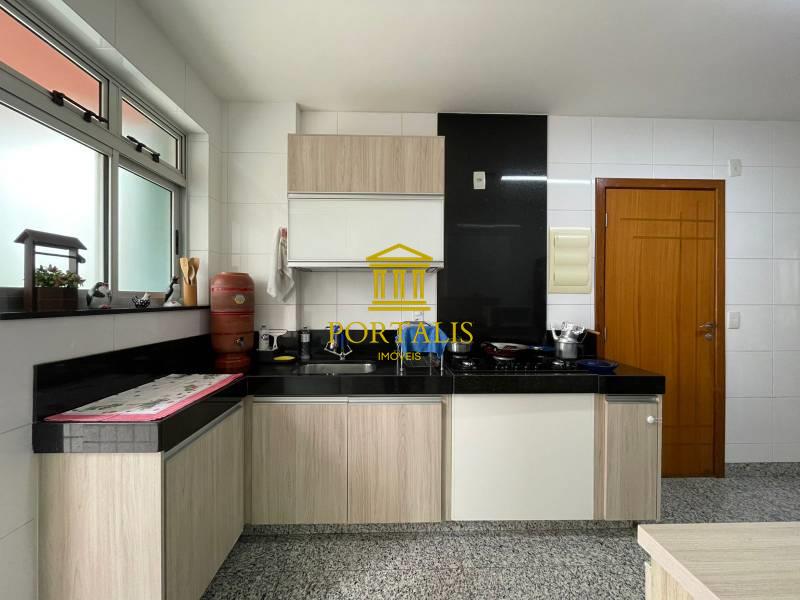 * Cozinha ampla com armários, bancada e piso em granito.